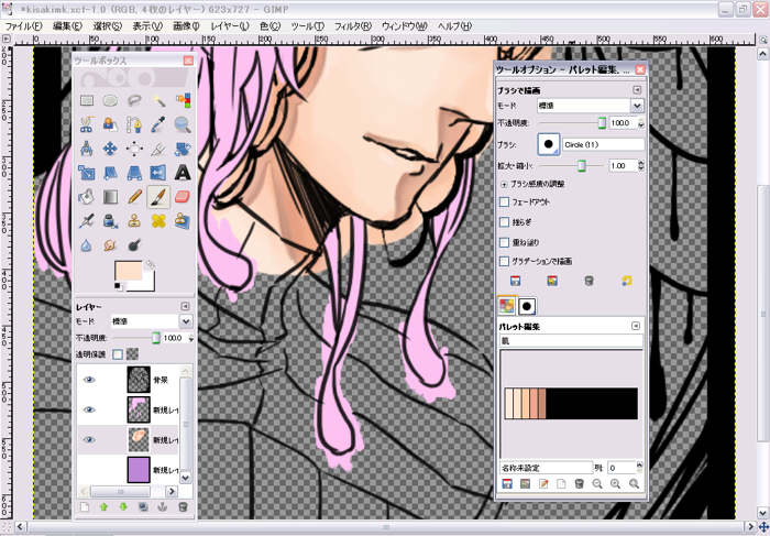 Photoshopキラーと言われるフリーソフトGIMPに挑戦中です。 塗ってる時の感覚と色味が好きだが高性能過ぎて使いこなせない^p^ 初めのインターフェイスで「!!!!!????(^ω^;)」ってなったけど弄ったらちょっと使いやすくなった・・・!