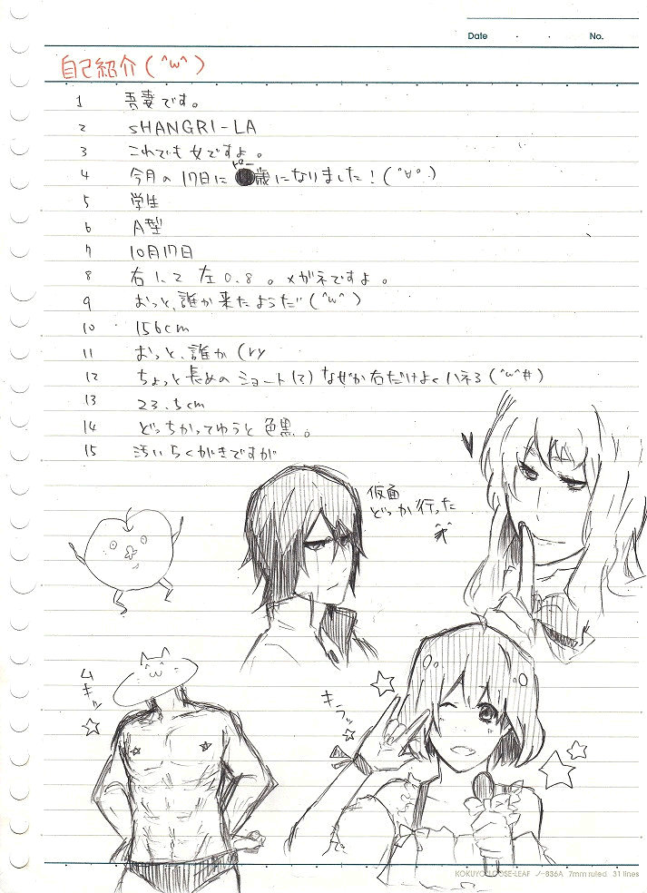 はるぽんから地雷バトンです。スルーでもおk! 項目はこちら↓ 1.名前(HN) 2.サイト名 3.性別 4.年齢 5.職業 6.血液型 7.誕生日 8.視力 9.体重 10.身長 11.体型 12.髪型 13.足のサイズ 14.色白or色黒 15 .落書き です。パソコンor手書きでお書き下さい。 それにしても吾妻の字汚い('A`)誤字脱字などがあったらすみません